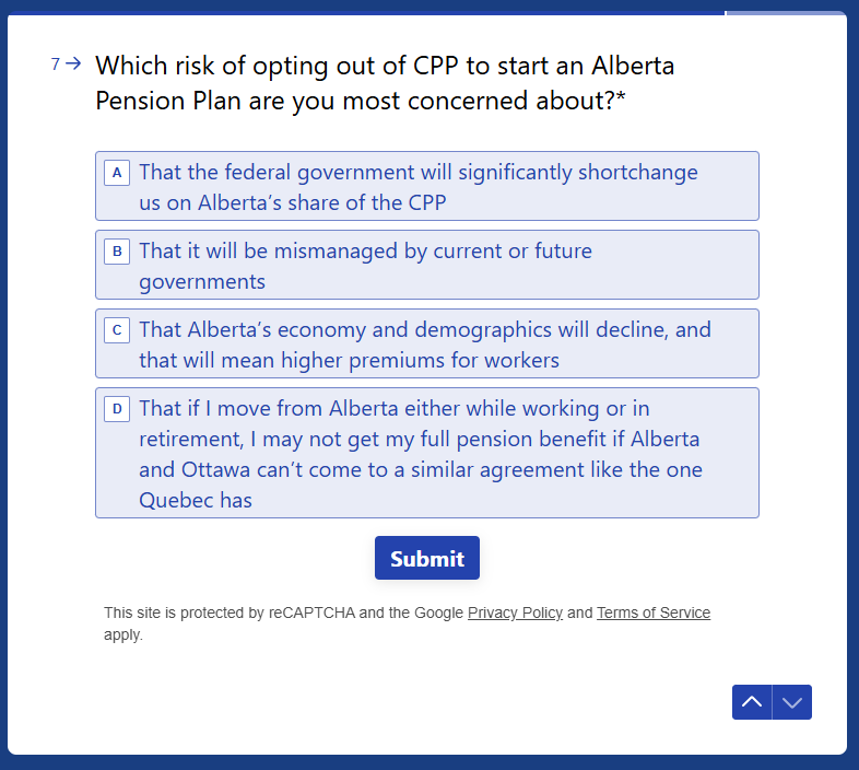 Here are the questions from the APP survey for the Alberta Next panel. It makes you watch a 5 minute propaganda video, and does not allow you to respond "other" or disagree with the premise at all.