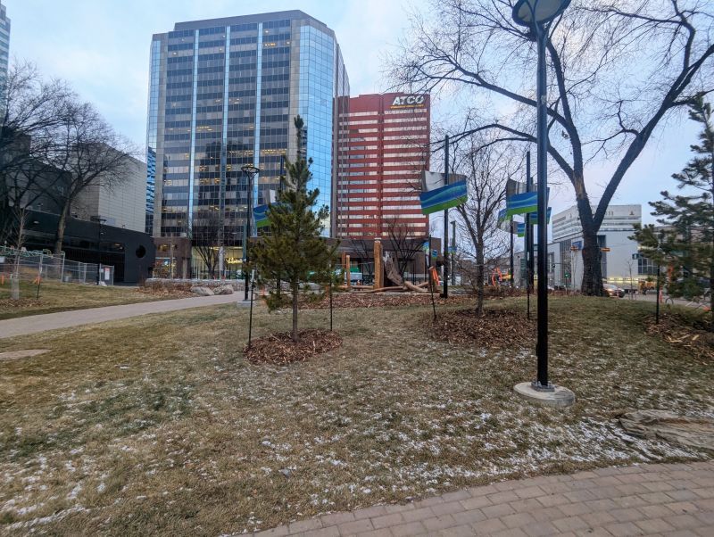 The sign with Cree syllabics is also nice. Notice the birds on the polls are from the mural on the retaining wall that was taken down.