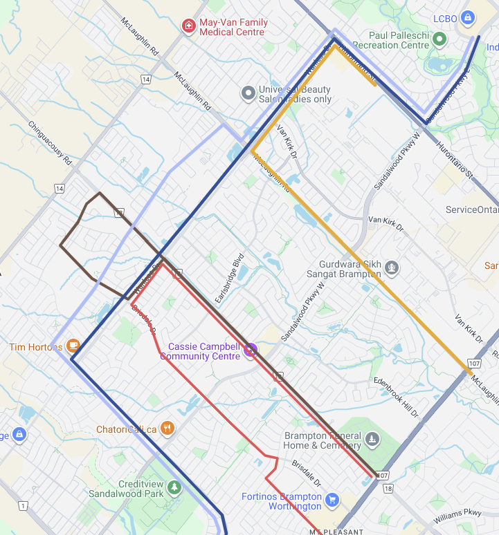 The 4C variant will operate on Sandalwood to Walness, then along Walness, Brisdale south to Bovaird and west on Bovaird to Mount Pleasant GO. This is the same routing that the route 4 variant currently utilizes which is being renamed as 4C.