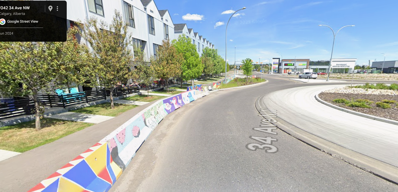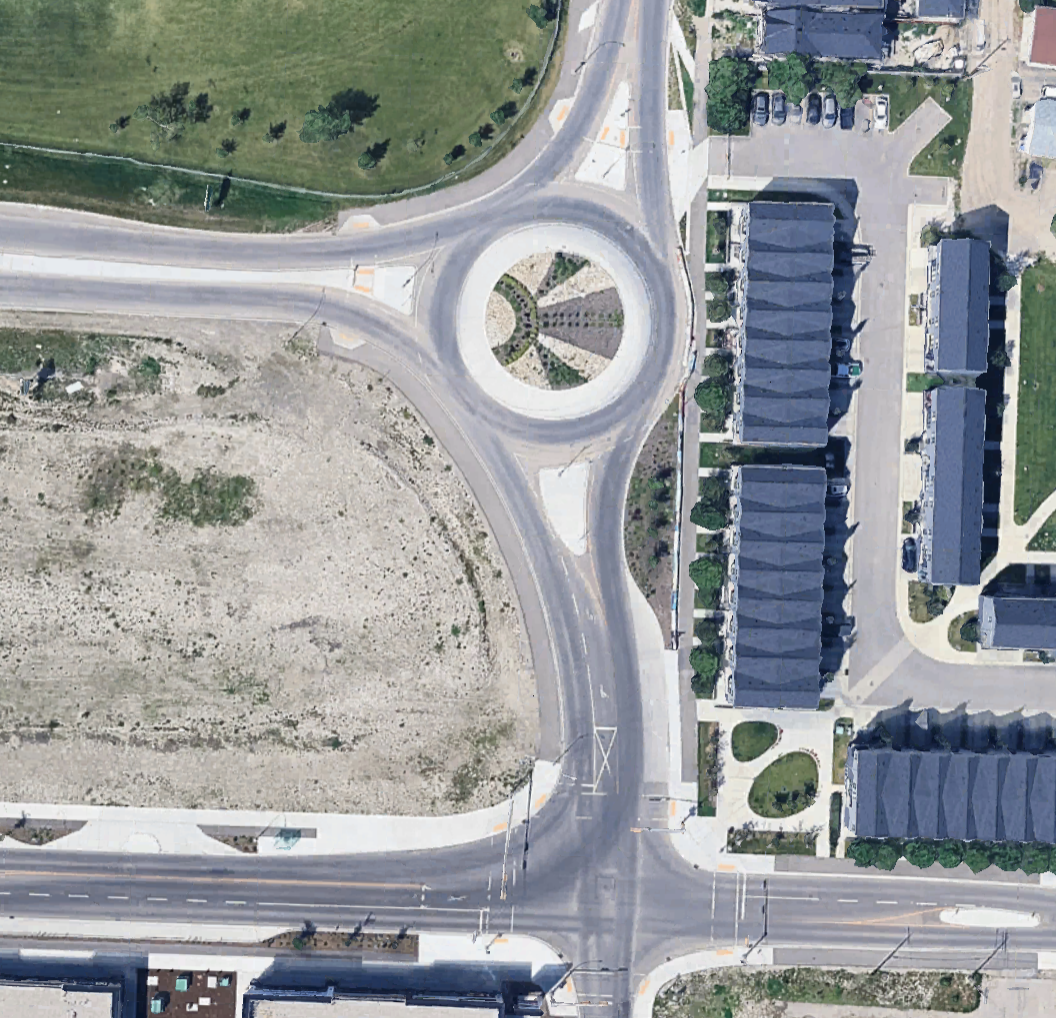 It's my main gripe with our planning system overall - almost no other place builds like this. It's not just the amount of asphalt and land consumed for vehicle movements (which is wildly excessive), it's the attention to detail for one road user group only that is so obviously driving all design decisions at the expense of all else (truck movements to Superstore). Look at how much curvy, turning radii math went into supporting truck movements here with widths of every element excessive for even the largest vehicles. Every corner is swooping and unique. The only below-standard elements are any provision for street trees and the deviation/narrowing of the pathway so the round-about can be even larger.