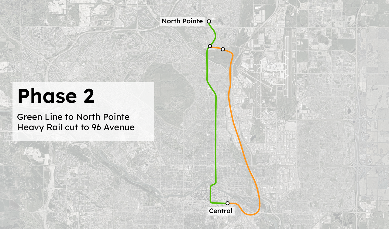 If we don't want to cross the LRT at grade right now because of operational reasons, then the two legs can just end either side of 7th Ave, and the few people making the southeast-to-north central trip have a short walk to transfer, but everybody who is going to the downtown has a train to the centre, and everybody connecting to the blue or red lines has the same short walk to transfer they would normally -- in fact, shorter in many cases since they don't have to go up three floors or down two. When the 8th Ave subway is built and the red line moves off of 7th Ave, we can reconsider connecting the Green Line, since 7th will have a lot fewer constraints.