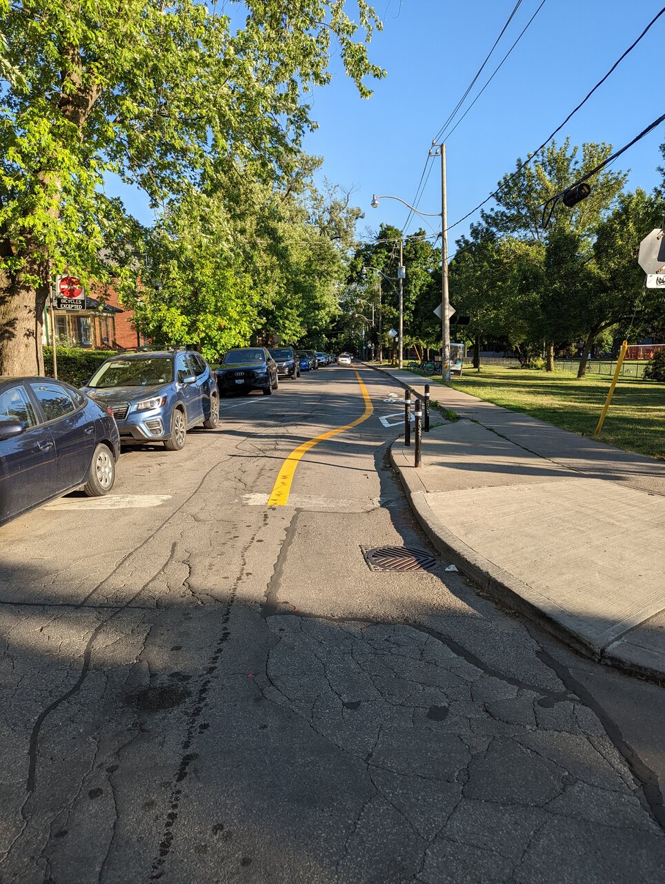 Southbound on Havelock at Dufferin Park, there's a pinch point. I guess the cars on the left are parked illegally? Some enforcement may be needed to keep the contraflow lanes from being taken over by oncoming traffic here: