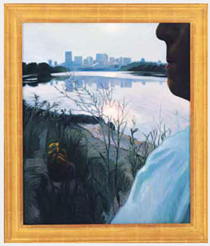 This is Edmonton, Alberta. Most of my relatives live there. In the distance you see a skyline. The Edmonton skyline came up late and fast because of oil money and is mostly glass buildings, so from a distance the pink glass or blue glass, it's quite an Oz-looking place. And in the bend in the river there is a foot bridge or a bicycle bridge, and there's a bicycle path that comes along this side, again, right at that point that stands out at the left-hand side. The following day I gave a concert. So this is the day before the concert and very close to the concert site but this is the North Saskatchewan River. The figure in the foreground is my boyfriend who's from my hometown. Donald and I grew up playing on the banks of the South Saskatchewan River, and one of the reasons that a lot of these images of he and I -- well, they're not all here -- they take place -- we have a Saskatoon, Saskatchewan thing about walking in parks. I don't know, it's just something locals do, you know. So we always end up in every city that we are renting bicycles whether it's in Rome and riding our bikes through parks and a lot of the images that I track home with me to paint come from those public spaces.