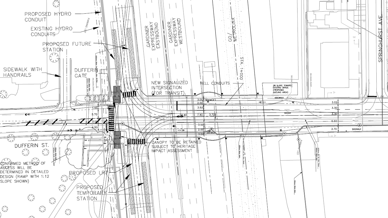 Don't see any platforms being extended to Dufferin St once a new Dufferin streetcar track is built on it, since there will be no stop there. The EX will be the stop. Moreso, no room for the westbound. If a stop is added at Dufferin, it will be an east-west to allow interchange with the new west line going to the Humber and that is decades off.