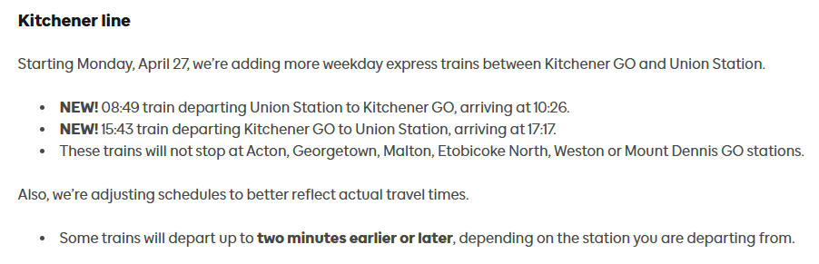Past that, trains are usually skipping Etobicoke North and/or Malton, or going express altogether from Bramalea. Skipping Weston is new too.
