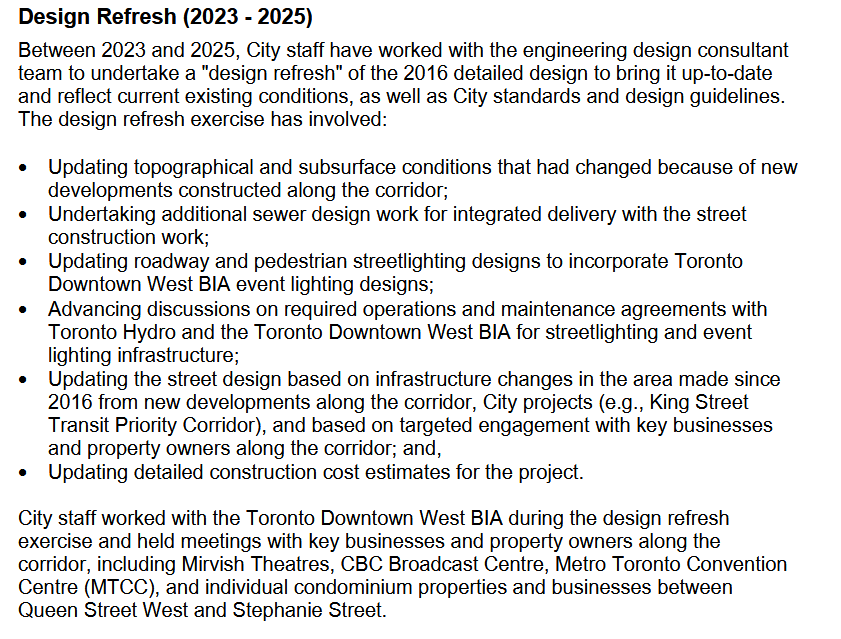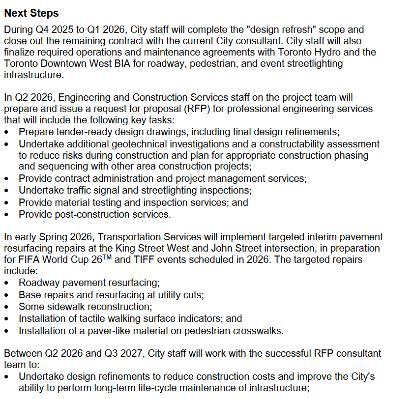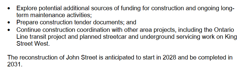 The report does indicated a realistic path to construction that would be difficult to accelerate from this point. These projects need ~2 years for detailed design and procurement and this is fairly consistent across municipalities.I find it very hard to believe that YongeTomorrow, ReImagine Yonge, John St renewal, and Queens Quay E improvements will all be constructed in the same timeframe.