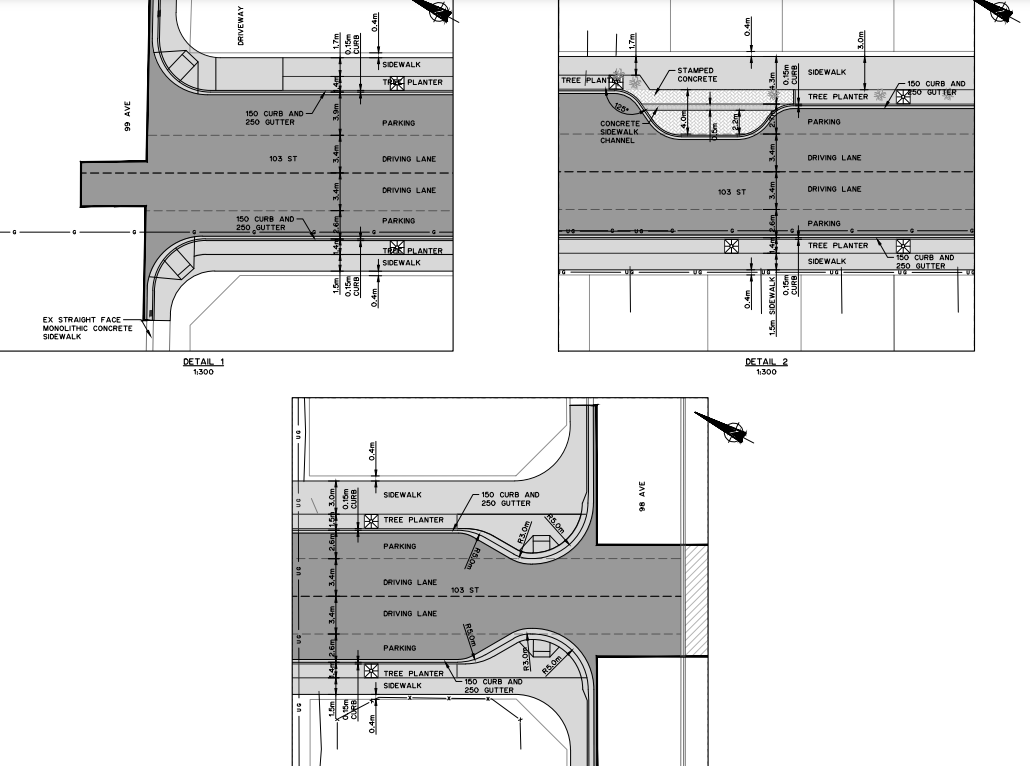 A stretch of 104 St will be getting similar treatment as well. During the road rehabilitation project this summer, the city is putting in a bike path on the north side, accompanied by a 1.5m sidewalk. On the south side, the existing sidewalk will be replaced. The bike path will be isolated from other bike infrastructure to start with, but hopefully the city will continue to add more paths like this during future rehab projects in the area.
