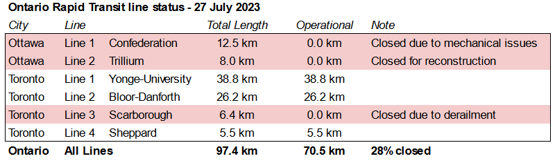 I didn't include streetcars, though that would be interesting if I took the time to figure out how much of the TTC streetcar network is actually running right now.