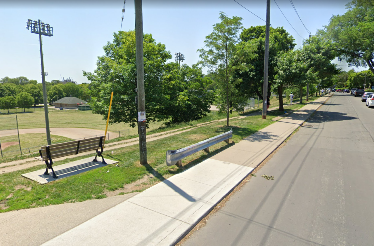We'll start our tour at what I think is or ought to be seen to be the principle entrance to Christie Pits Park at the corner of Bloor and Christie, with a streetview pic from 2020: