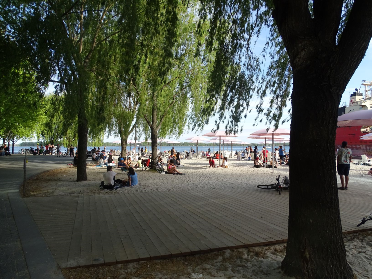 Just oodles of people out enjoying themselves, in the sun, and in the shade, chatting, sunbathing, taking a respite on a bike ride, or watching the ships sail by........