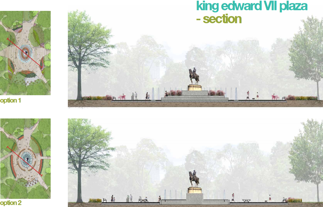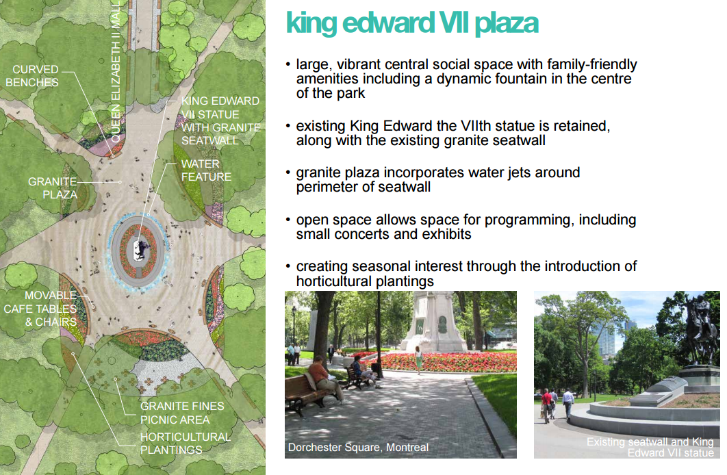 1. King Edward VII Plaza – new unit paving, extensive new seating with wood and metal benches, completion of the granite seat wall, regrading to remove existing berm