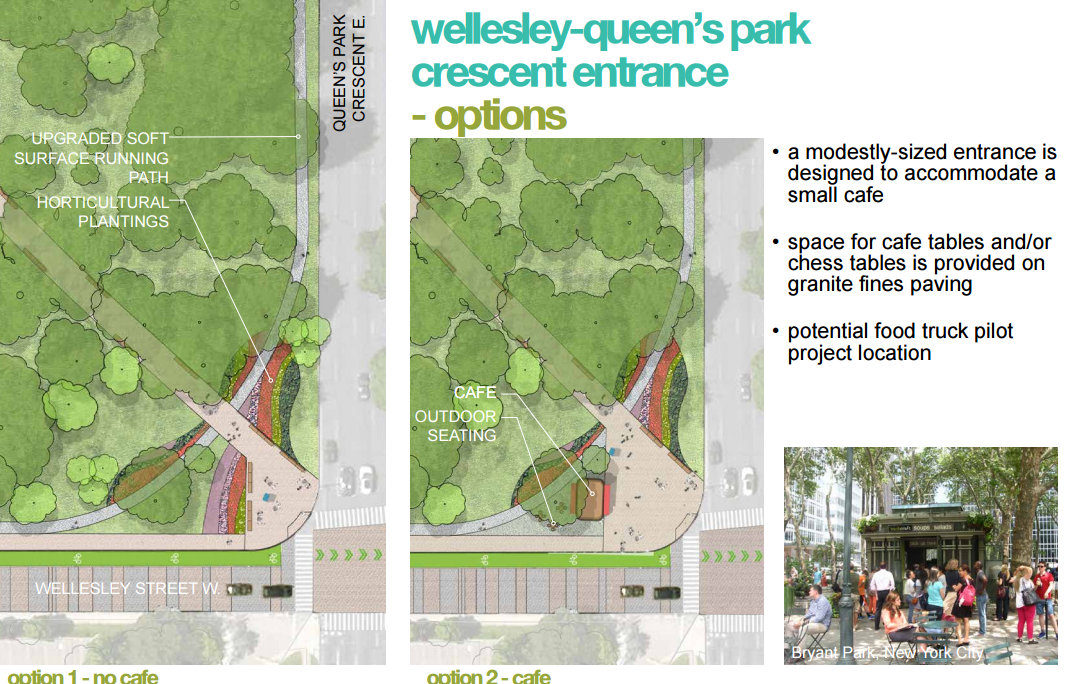Here are some renders/slides from that old presentation AoD linked to a few posts back; I bike around the park every day and am very excited about the facelift. It's both very well-used and badly falling apart. Tough to tell (at least for me) from that tender call precisely how much of the below is encapsulated in this round of improvements, save for the three items explicitly identified as being outside the scope of this current project: Wellesley St. improvements, a cafe, and a pedestrian-priority entrance at the Highlanders Entrance.