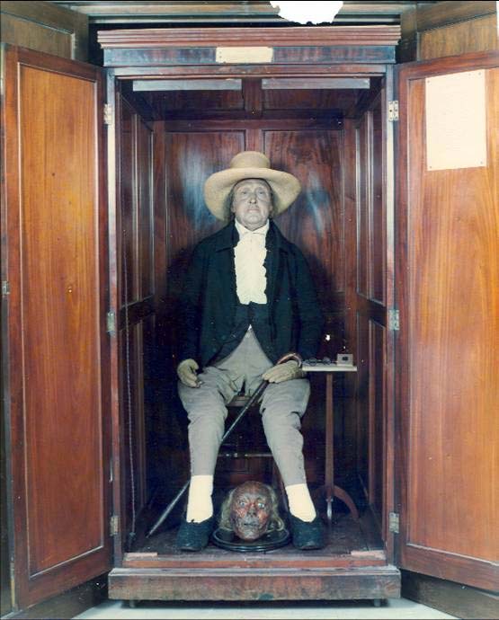 There's a precedent - Jeremy Bentham, the English philosopher and educator, died in 1832 leaving instructions for his body to be dissected, and then permanently preserved as an "auto-icon" (or self-image), which would be his memorial. The auto-icon continues to be on public display at University College London, propped up in a box and appropriately clothed - a key part of the welcome tour for new students and visitors. Every few years it is "restored" to stop the whole thing falling apart.