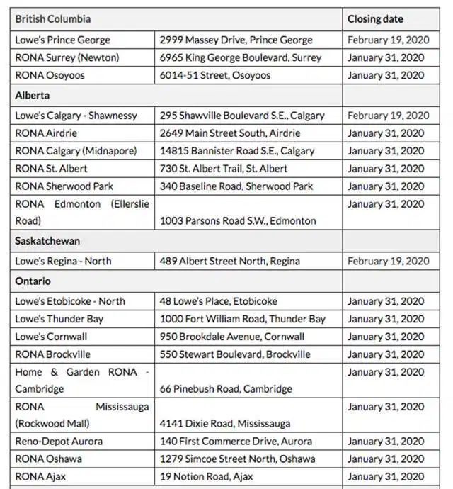 The stores, which include Lowe’s, RONA, and Reno-Depot brands, will close in January and February of 2020