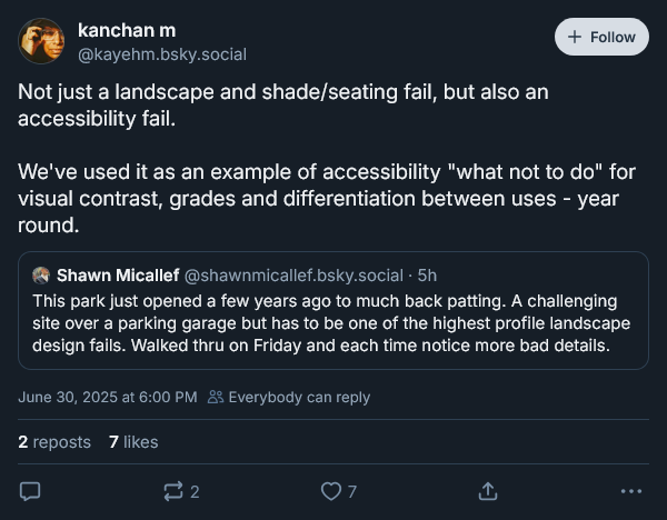 ...at some point in the future (perhaps a distant one) they should consider of removing the underground parking lot from this park space all together. And refilling with all earth and flowers. Likely wishful thinking though! <3