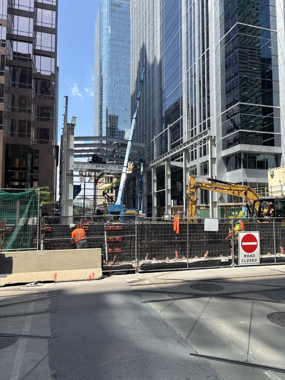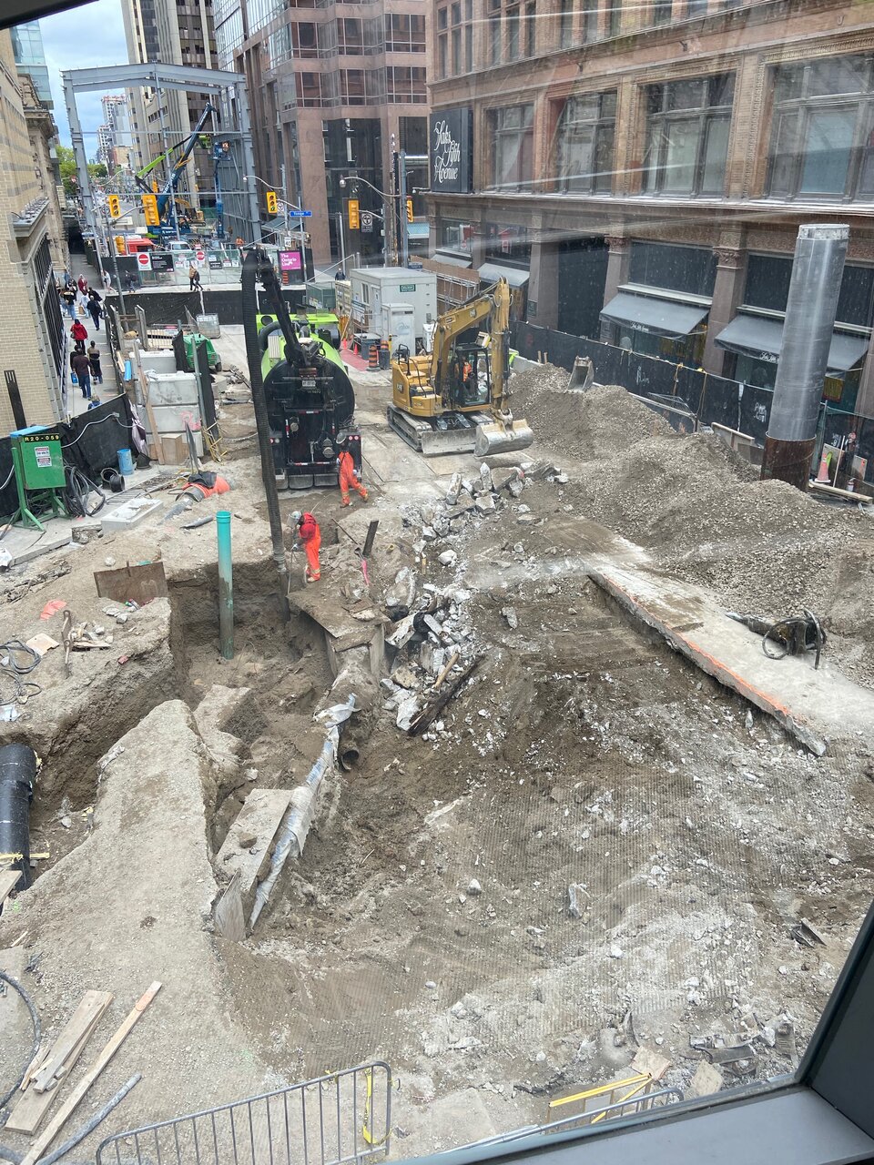 Relocating utilities, very thoroughly surveying to avoid impacts on all existing structures (including PATH, Yonge subway and all neighbouring buildings), and the piling which is probably more strenuous than elsewhere because of all the structures that need to be protected.what exactly have they been doing there for the last 2 years?