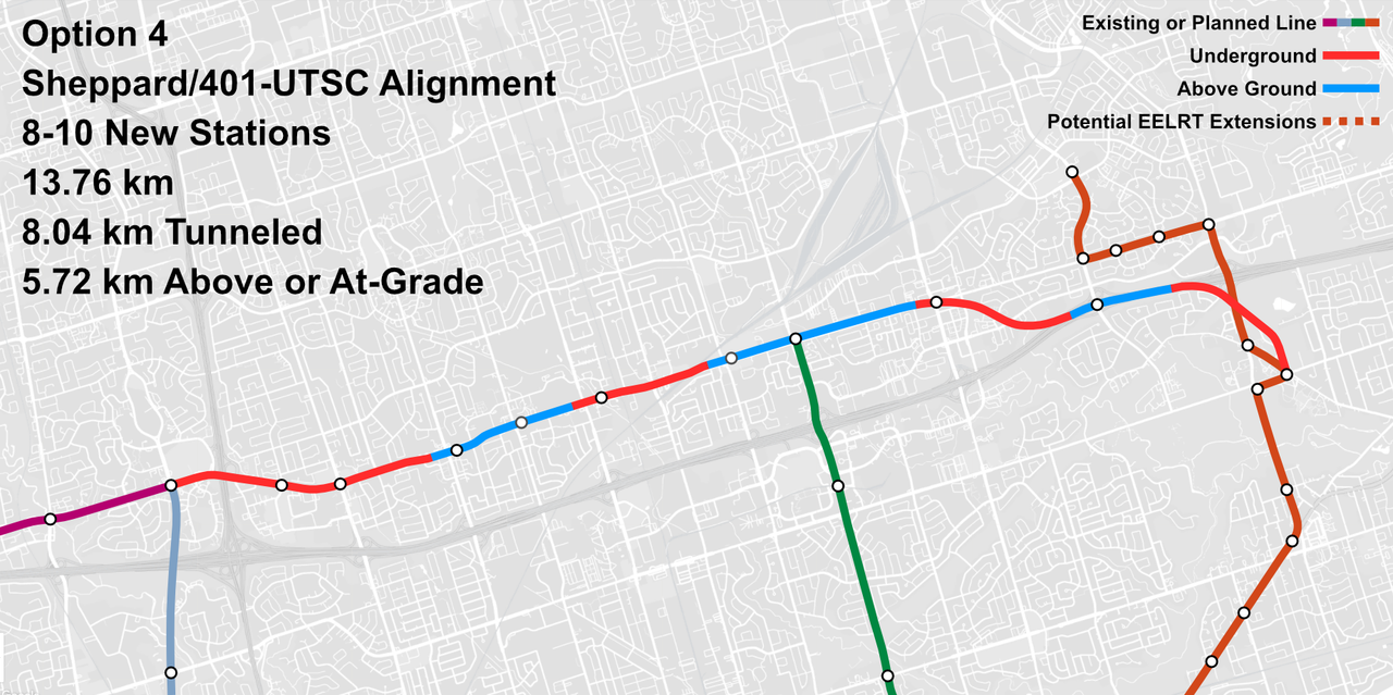 Option 4: Too many transitions between above-ground and below-ground segments + weird connection with Eglinton East LRT