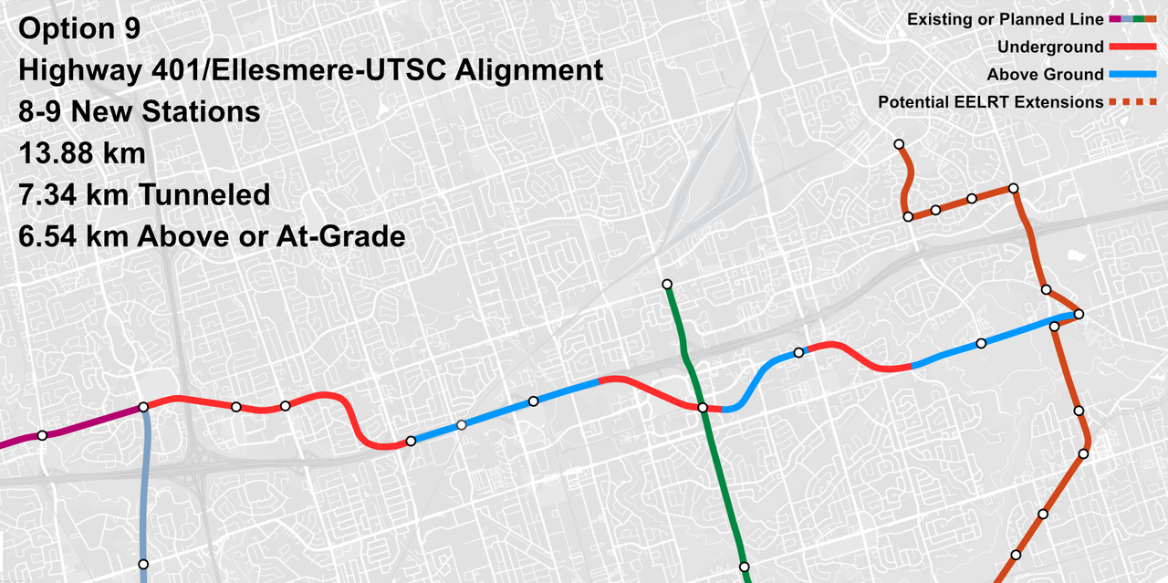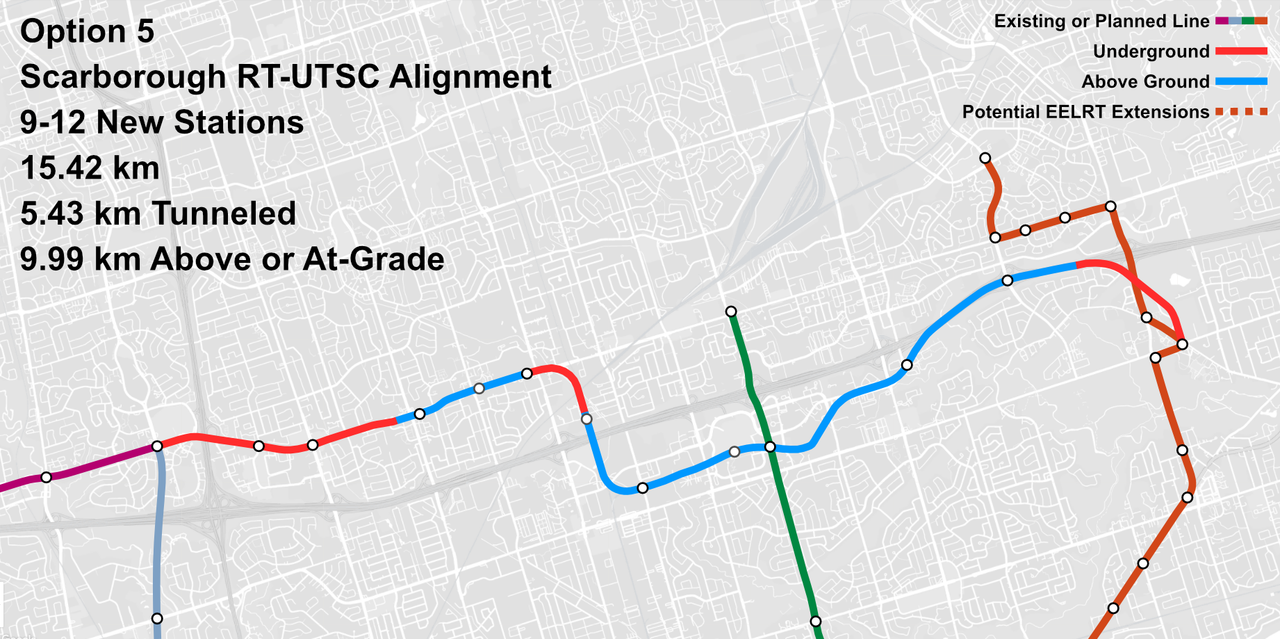 Option 5: It will be very difficult to transition from below to above at the Stouffville Line as there is the hwy 401 and west highland creek + weird connection with Eglinton East LRT