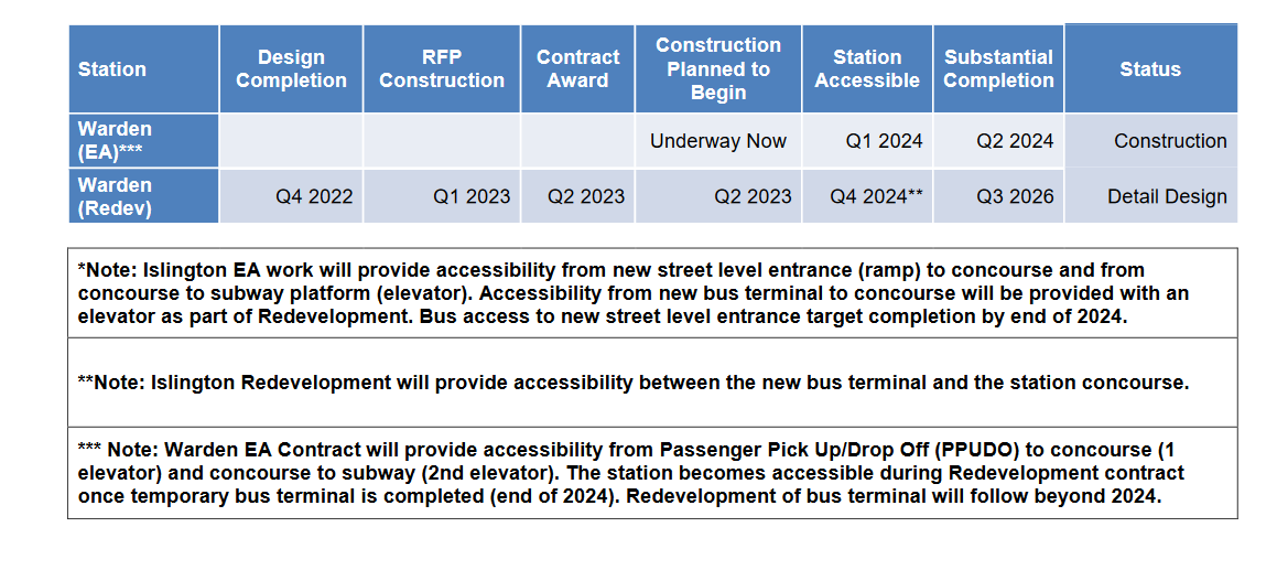 I do believe work is in the process of getting underway at Warden. There are 2 large white construction trailers in where the bus bay exit area is. One of the trailers arrived last week and the second came this week.