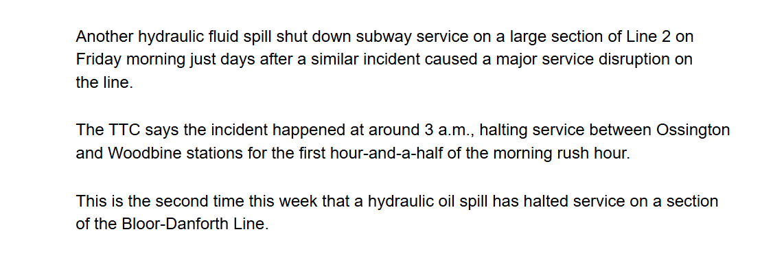 Knowing nothing about hydraulic systems.....I'm curious also about the hydraulics on these machines.... just how much fluid do they carry and what is the potential release under worst case? I witnessed a spill from a garbage truck that shut down a major intersection for several hours....that one was a very small spill....it doesn't take much volume of fluid to really mess things up, but one wonders how large the TTC incidents are in comparison.
