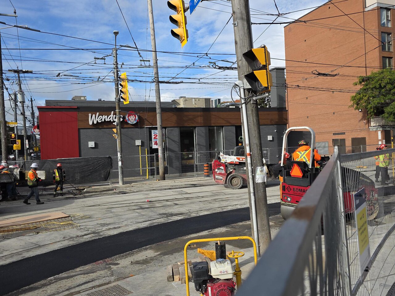 However, as can be seen in the photos taken this morning (October 23), the project appears to have progressed well, with the TTC related activities soon to be completed. All the track has been installed, all the concrete has been poured except for one very small section at the north-east corner of the intersection. Almost all the asphalt work has also been completed, with work on the remaining sections underway this morning. One final TTC related note - it appears that the overhead system through the intersection is still intact, is not being rebuilt as part of this project - rebuild of the OCS does not appear to be included in any of the project descriptions.n
