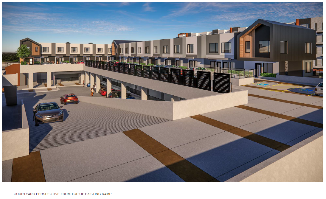 And then the mixed use building in the NW corner of the intersection. This one appears to have a unique parkade, with open deck parkign on the 2nd level, leading right to the back door of the townhomes that are stacked on top of retail: