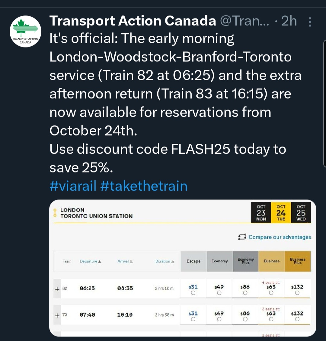 MONTRÉAL, September 7, 2023 – VIA Rail Canada Inc. (VIA Rail) is pleased to announce the reintroduction of two round trips between Toronto and Ottawa and one round trip between London and Toronto, starting this October.media.viarail.ca