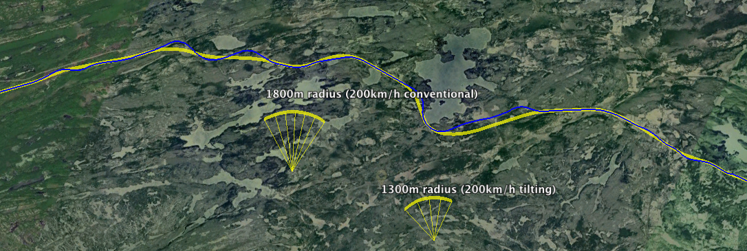 Using Google Earth, I've been trying to conceptualize how the Havelock sub would need to be realigned to support the continuous 110mph (177 km/h) speed limit required to achieve VIA's 160km/h average speed claim. First I drew 1300m and 1800m curves on the ground, which are the minimum radii at 200km/h for tilting, and non-tilting trains respectively, according to