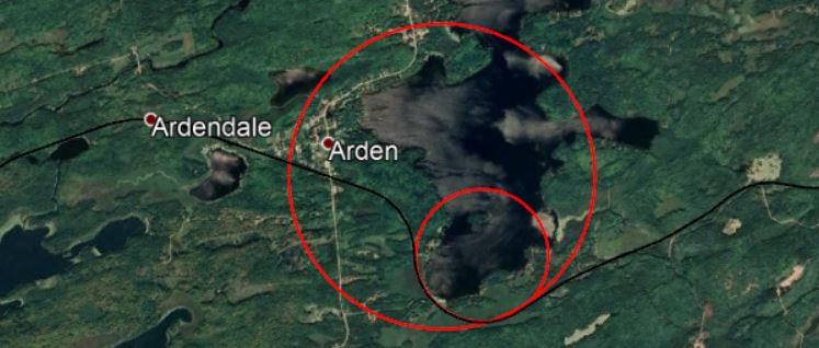 For the 87 kilometres from Kaladar to Glen Tay (just west of Perth), the line traverses rough rocky terrain dotted with lakes. As a result, the line follows a meandering path with frequent tight curves, with a radius of about 550 metres. This would only allow speeds around 80 km/h (50 mph) or so. Basically none of the existing ROW is useable for 110 mph operation since the curves are too close for the realigned route to rejoin the existing ROW before the next curve.
