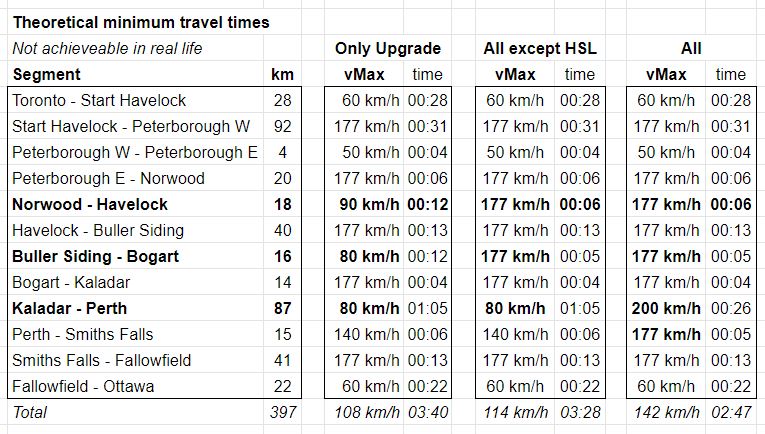 The interesting thing here is that in either of the options without the new 102-km high speed line (HSL), it is physically impossible to achieve the 3:15 travel time that VIA