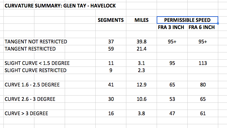 Translation: There are 86 segments where the as-exists curvature exceeds 1.5 degrees. At that curvature, a "typical" train would have to reduce speed to negotiate the curve. My assumed "typical" train is the equivalent of an LRC with tilting deactivated - ie, assumed track superelevation (banking) of 3 inches, and equipment with a "cant deficiency" rating of 3 inches. (I pulled the LRC specs from memory, and may not be accurate, but it's just a straw man anyways) The speeds shown under the "FRA 3 inch" collumn are the speed allowed by the US Federal Railroad Administration for that track profile. (Note that the length of the curve does not affect the restriction - although a longer curve will require holding that train to the restricted speed for a greater distance).