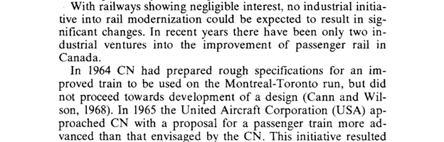 I was considering to crop away the "Turbo Train" section when posting the April 1967 schedule, but just to make the point for how representative that schedule is: the travel time of 3:59 lasted no longer than the first deployment of the Turbo Train (one month) and was subsequently increased to 4:05 (second deployment in May 1970), 4:10 (third and final deployment in 1973) and 4:30 in 1977 (when VIA took over) before the Turbo Train was replaced with an LRC train of the same timing (oh, yes, and it never operated at more than 30-60% of the originally promised service level of 20 departures per week):