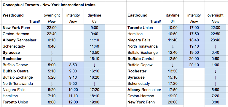 10 hours also happens to be the ideal duration for an overnight train. You can leave one city at around 10PM and arrive in the other at 8AM - with just enough time for a standard 8-hour sleep in between. Such trains could be more profitable than typical long-distance sleeper trains because they avoid the need for expensive dining and recreation facilities - a single café/lounge car would do. I think the prospect of falling asleep in Toronto and waking up in Chicago or New York would be very attractive even if sleeper tickets are several times more expensive than daytime train tickets, because they directly compete with an extra night in a hotel. Economy-class coach cars would also provide a budget overnight option and make the train able to serve short trips within the daytime segments (such as Toronto-Buffalo and Albany-New York).