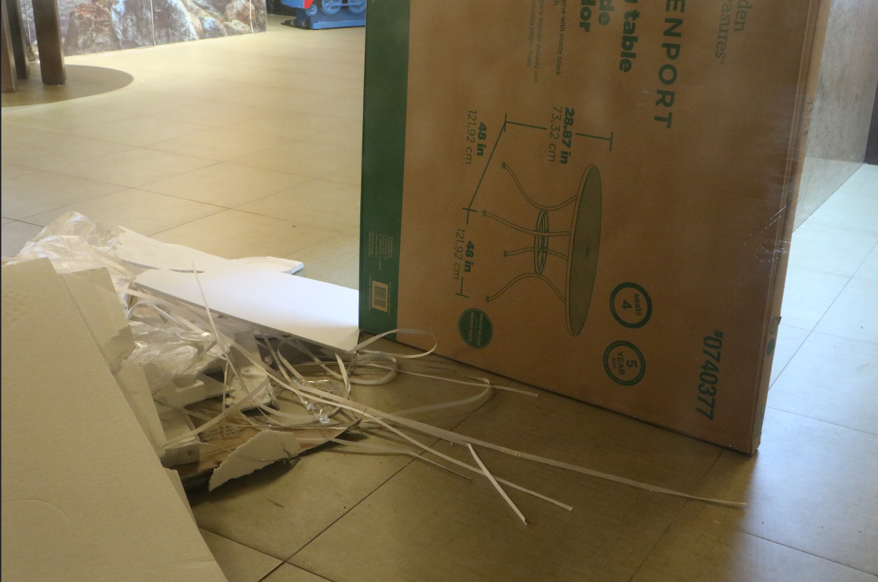 Skids of boxes are piled next to Woodbine Cinema's accessibility ramp. Most of which were most likely sold off months ago during Imagine Cinema's